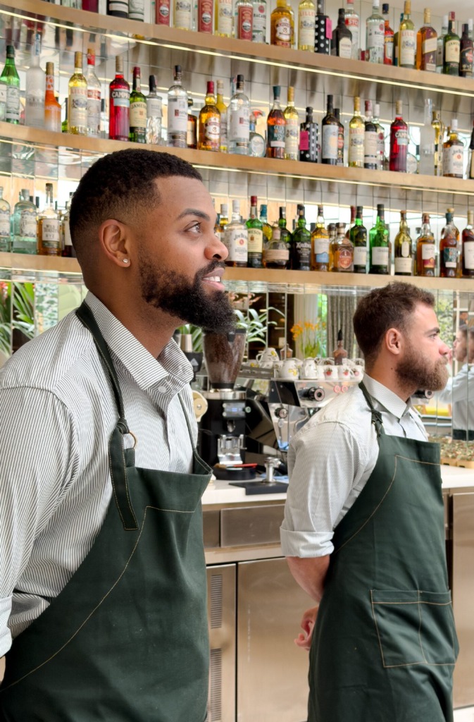 La solución adoptada incorporó elementos clásicos del universo de la restauración: camisas a rayas en verde, delantales largos en la misma tonalidad y pantalones caqui. La combinación crea una estética sofisticada y funcional, alineada con la atmósfera del restaurante.